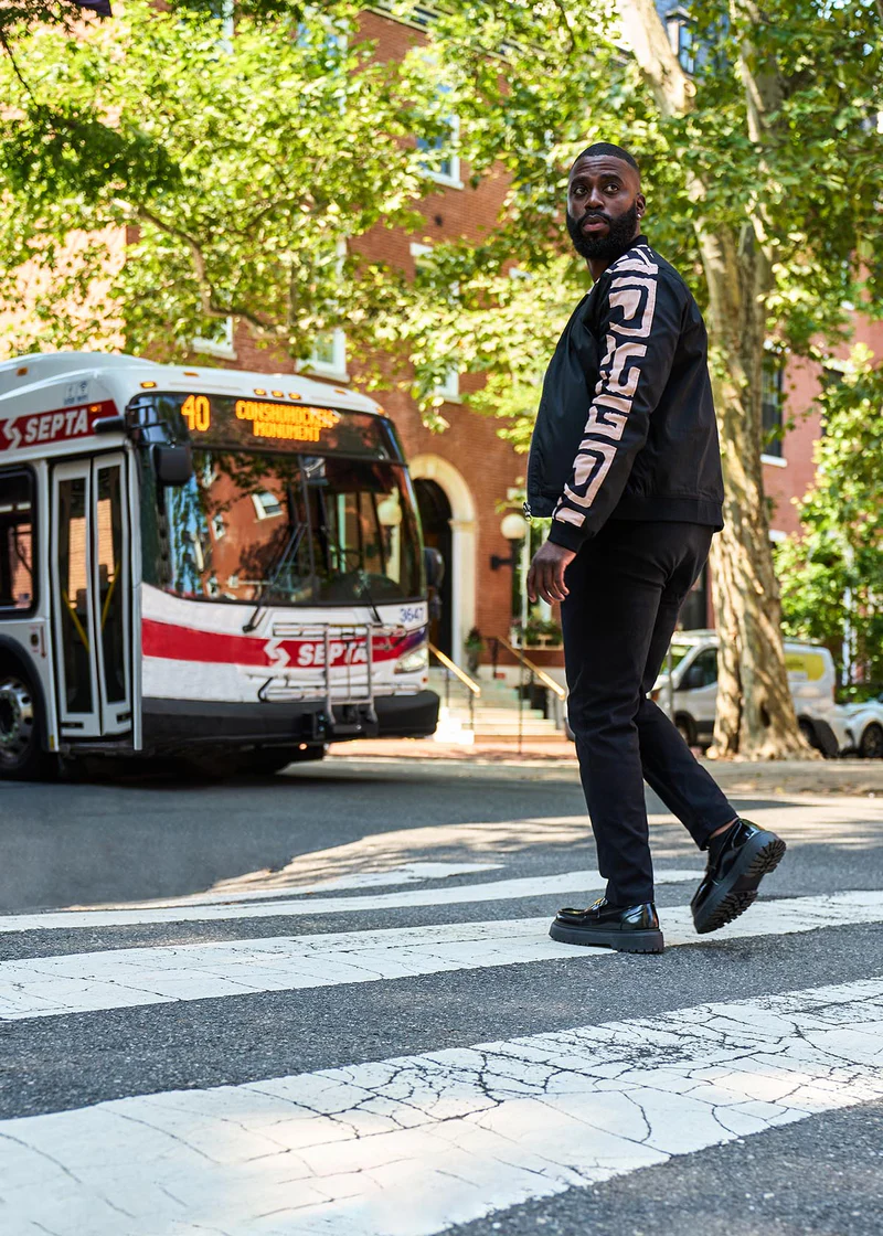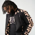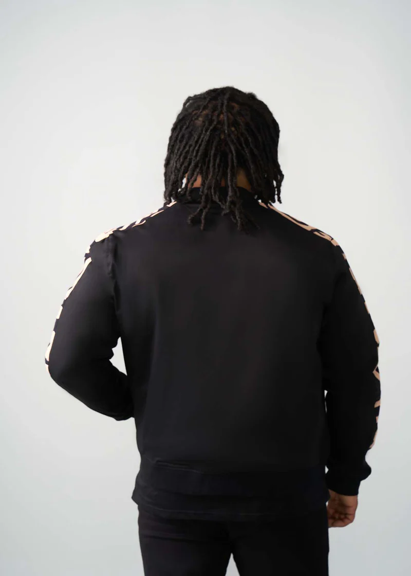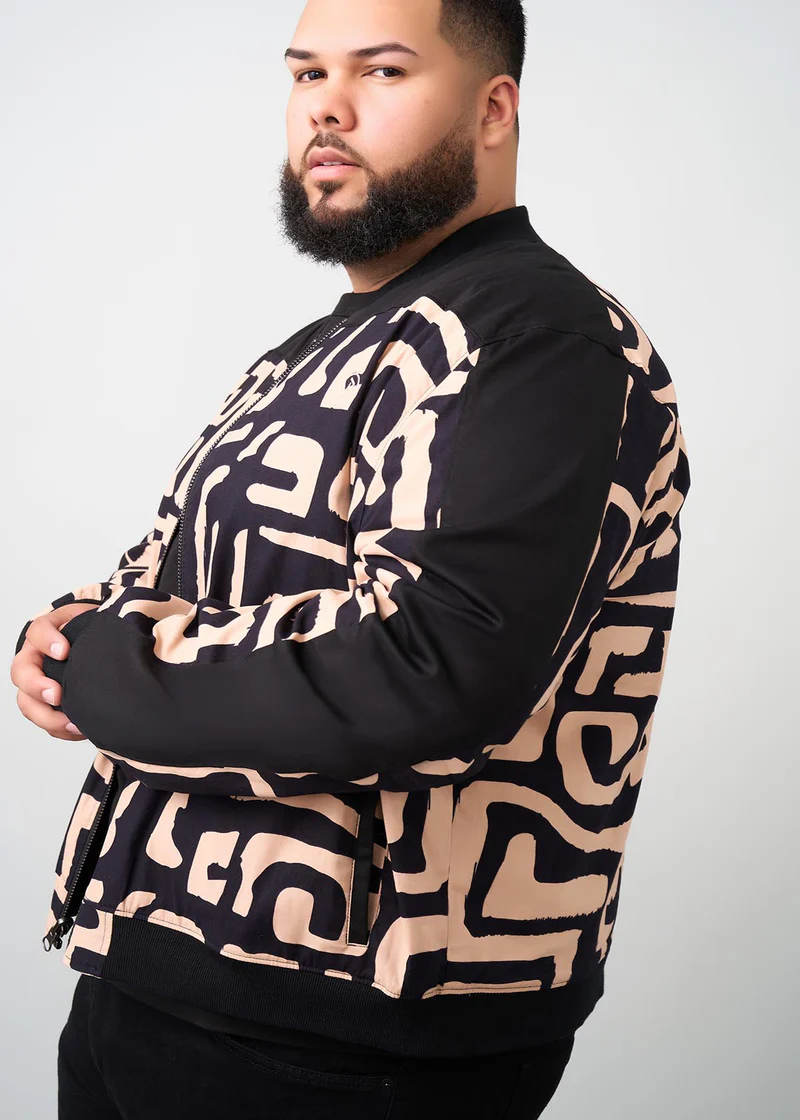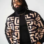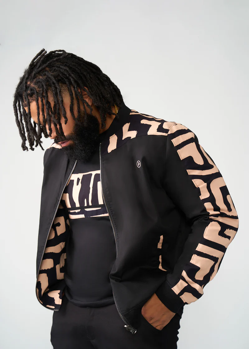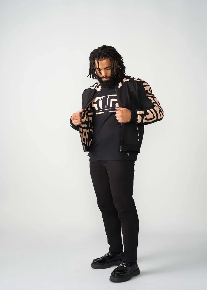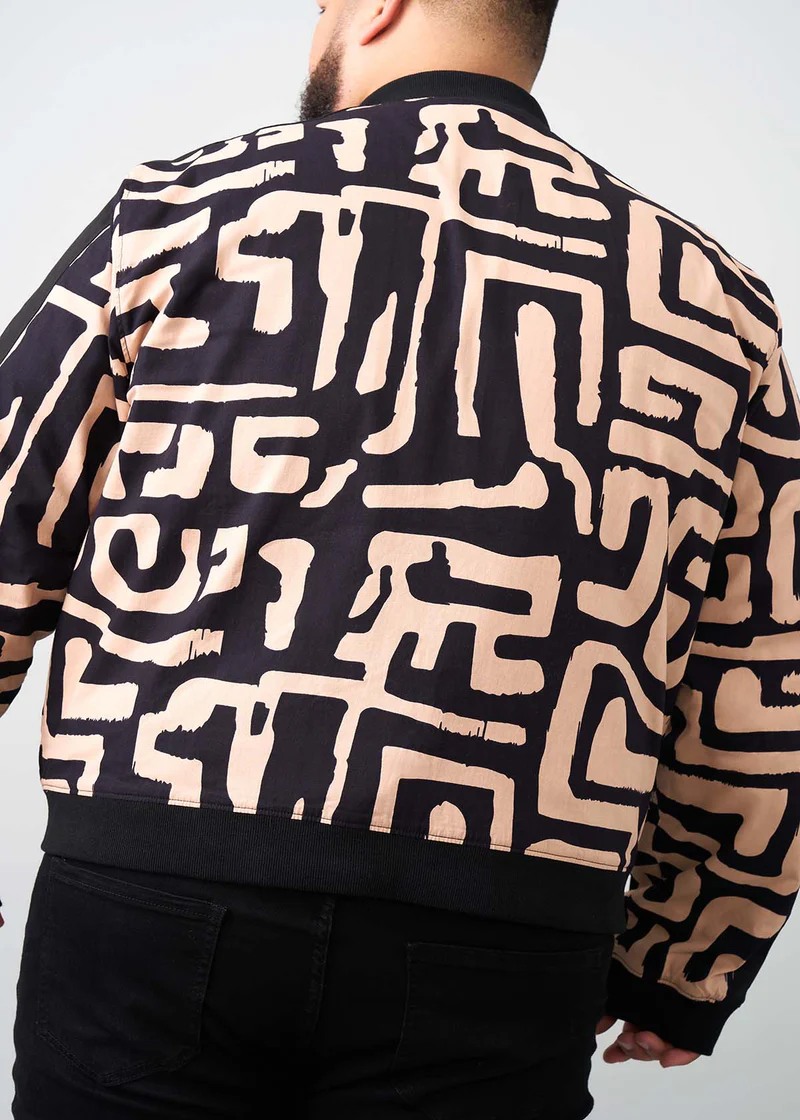 Represent and stand out in this reversible men’s bomber jacket featuring a black-tan geometric African print.