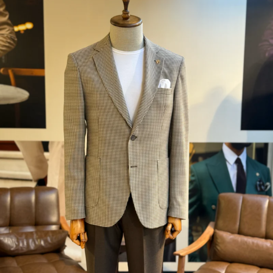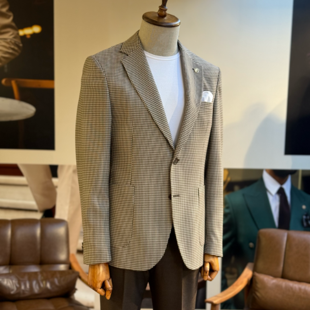 This brown houndstooth single-breasted blazer blends a heritage pattern with modern precision. The slim-fit cut sharpens your frame, while the subtle stretch keeps you comfortable whether you’re closing deals, attending a wedding, or stepping into a room that needs presence.