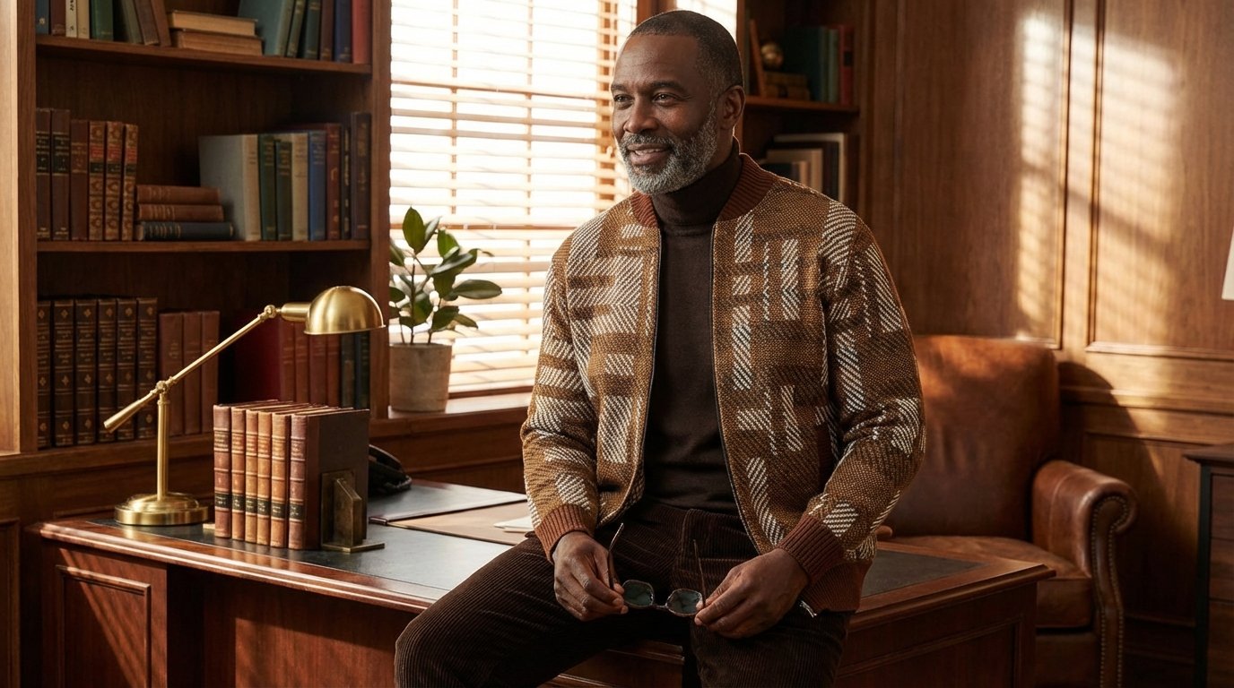 The Tonal Build: Brown corduroy pants (also shown in product images), cream Henley, brown leather boots. This approach picks up the earth tones in the pattern and extends them throughout the outfit. More harmonious than contrasting, it creates a cohesive autumn/winter look. The texture variation—knit jacket, woven Henley, corduroy pants—keeps it interesting despite the limited color palette.