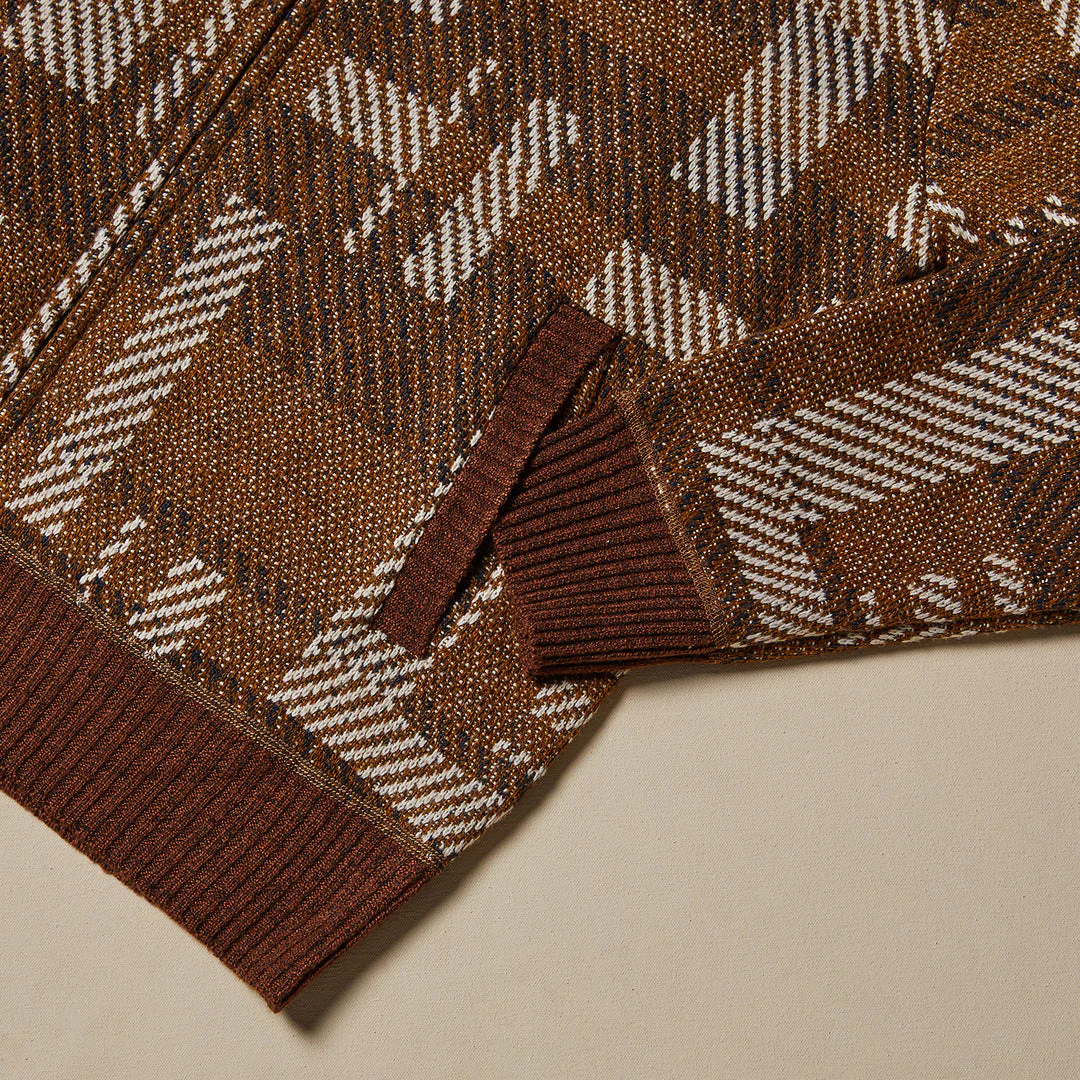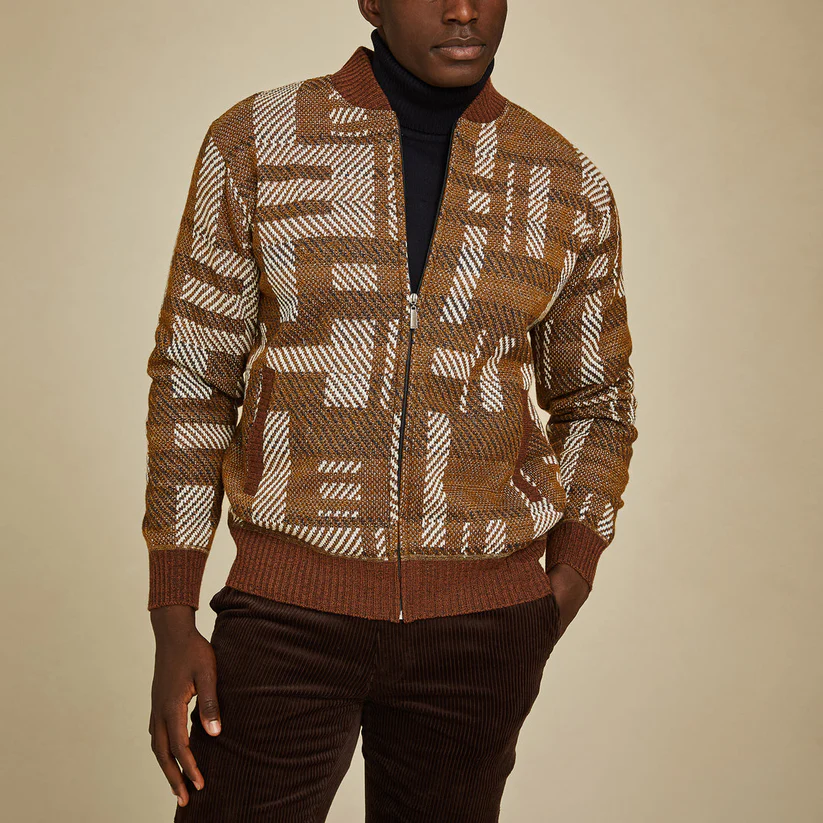 The geometric knit pattern alone represents significant manufacturing complexity compared to solid-color alternatives. Jacquard knitting requires specialized machinery and design work. Cheaper jackets achieve pattern through printing or appliqué—methods that don’t hold up to wear and washing the way structural knit patterns do.
